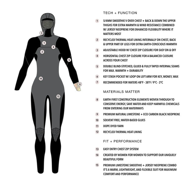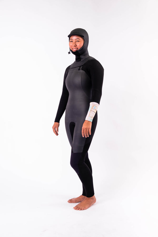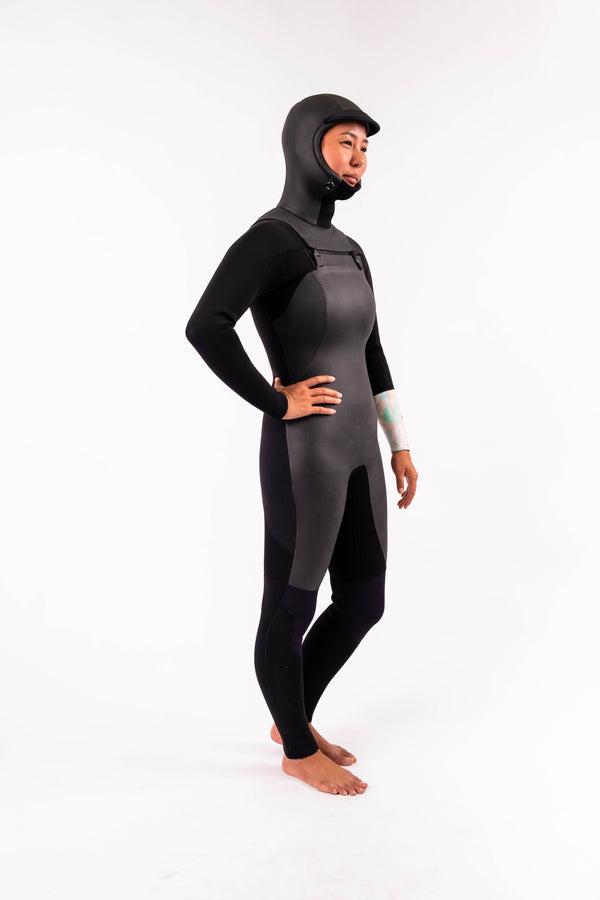 Nuestro traje completo con capucha de 5/4 mm tiene neopreno suave sobre el pecho, la espalda y la parte superior de los muslos para mayor resistencia al viento. Combinado con jersey de neopreno para mayor flexibilidad. Interiormente forrado con tejido térmico reciclado en el pecho, la espalda y la parte superior de los muslos. Costuras internas totalmente selladas. Capucha ajustable con cierre de cremallera horizontal en el pecho para ponérselas y quitárselas fácilmente. Donde se encuentran el rendimiento, la primera construcción y el ajuste. Esta colección se inspiró en la luz de la luna y se creó con neopreno negro de carbón ecológico a base de piedra caliza.
