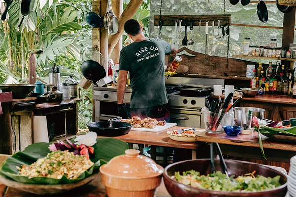 Expect family vibes, hand crafted glamping style accommodations, and deep connection- to the ocean, the jungle, and each other. Days flow between soulful surf sessions, yoga in a hardwood jungle shala, nourishing farm-fresh meals, and long evenings sharing stories beneath the trees.
