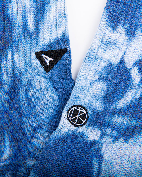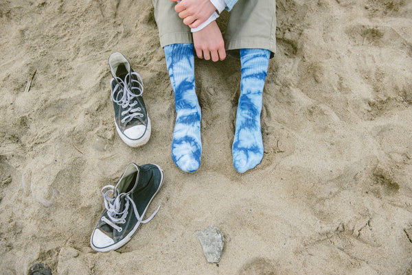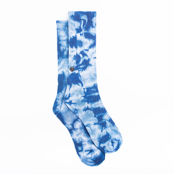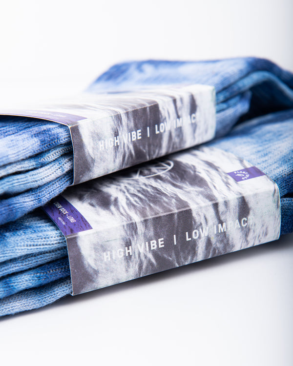 リサイクルコットンとリサイクルポリの混紡と天然インディゴの絞り染めを使用して作られたこのソックスは、清潔であると同時にスタイリッシュです。